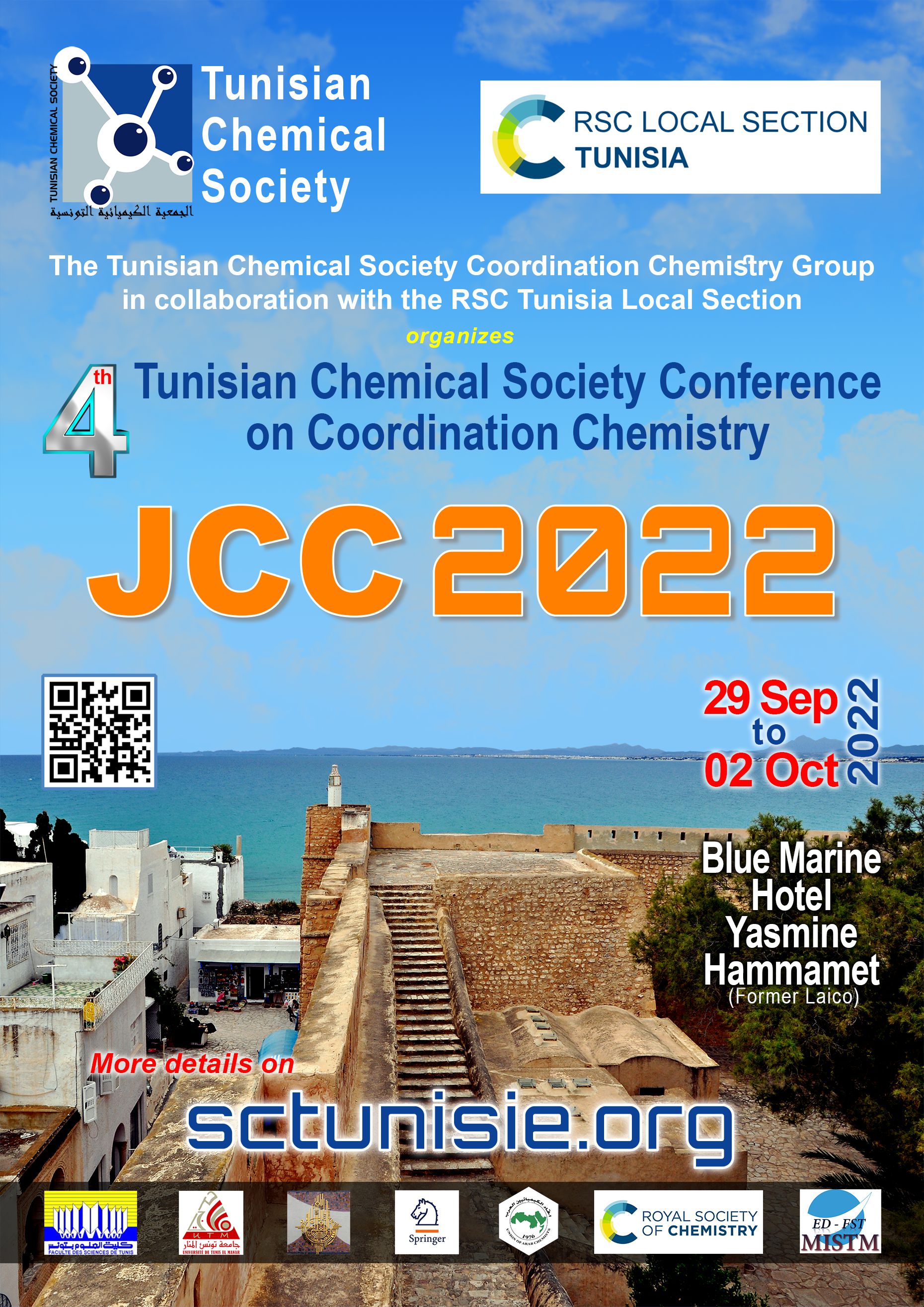 Welcome to the 4th edition of the Tunisian cheical Society Conference on Coordination Chemistry, which aims to provide a forum for discussion on all aspects of coordination chemistry and to give an overview of the state of the art in this field. Young chemists are particularly encouraged to participate and will find answers to questions that stimulate their ongoing research. They will be given opportunities to meet other participants and see things from fresh perspectives. Different subsections will focus on cutting-edge topics in coordination chemistry, including recent results that would impact our daily lives, such as the development of new ligands for drug design, catalysts for modern plastics and functional nanomaterials. The meeting will help scientists identify important applications of coordination compounds. The conference will bring together not only coordination chemists, but also organic and analytical chemists as well as scientists with academic (biology, medicine, physics) or industrial backgrounds to share scientific knowledge in an interdisciplinary atmosphere and foster collaboration between these scientists. This will generate a significant impact on future research in coordination chemistry at the international level. JCC 2022 will be held in one of the most beautiful coastal regions of Tunisia, the resort of Yasmine Hammamet. We hope that you will enjoy your stay in this wonderful resort and that your participation will be beneficial, fruitful and enjoyable. We look forward to meeting you at JCC 2022.